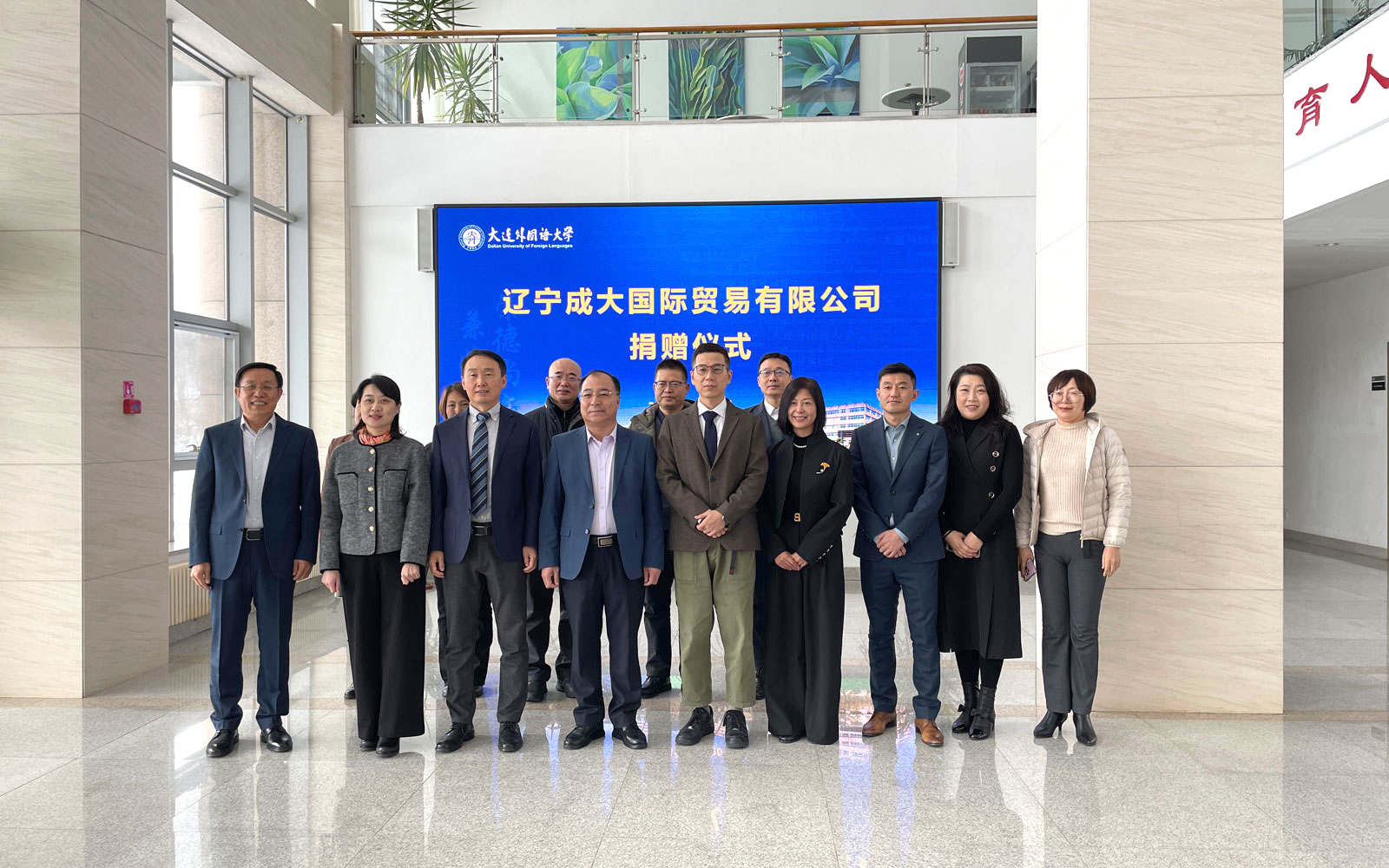 成大國際董事長金春洙、總經理高原等一行七人,大外黨委副書記叢明才及相關部門負責人出席捐贈儀式。儀式由大外校友工作處副處長卞瑩主持。